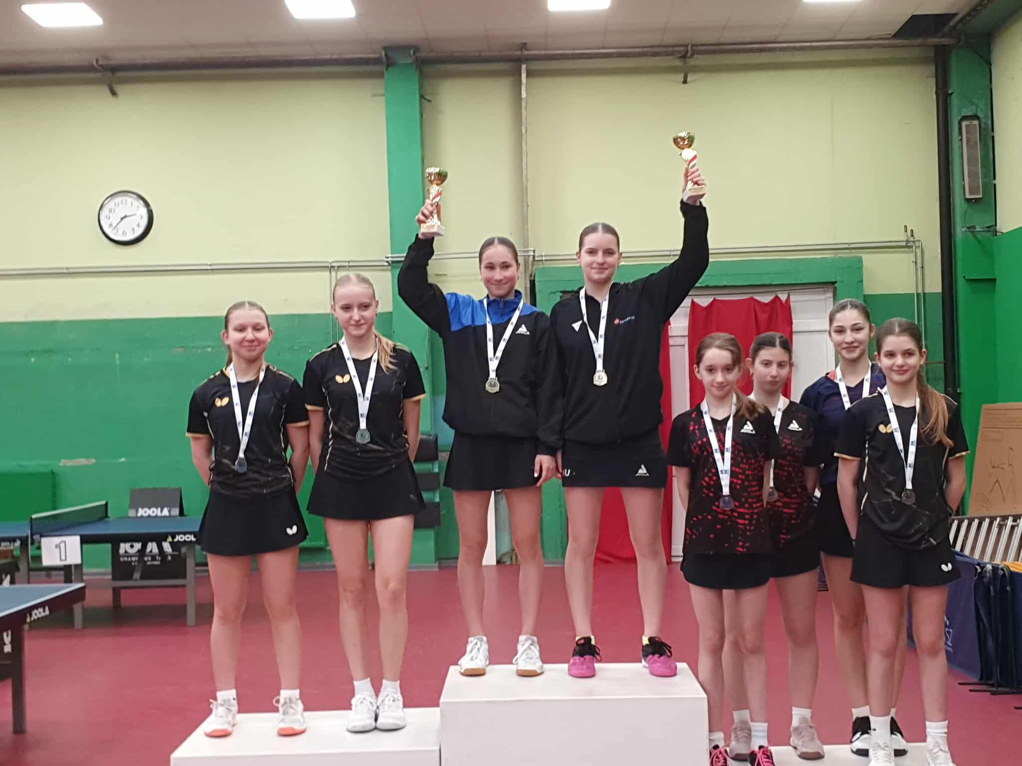 Elsőként a leány páros versenyszámában a Borics Gerda-Sós Réka (Kiskunmajsai AC) páros állt asztalhoz. Gerdáék a legjobb 8 közé lejátszott mérkőzésen 3:0 arányban maradtak alul a későbbi bronzérmes Váradi Emma – Vass Borbála duó ellenében. Fegyver Zsófia az idei szezonra új párostárssal indul a hazai versenyeken: első ízben indult Ivanics Izabellával (Pingpongozz Velünk SE) akivel ugyan akadtak nehézségeik a verseny során, ám végül több mérkőzést is vesztett állásból megfordítva a dobogó legfelső fokára állhattak fel!