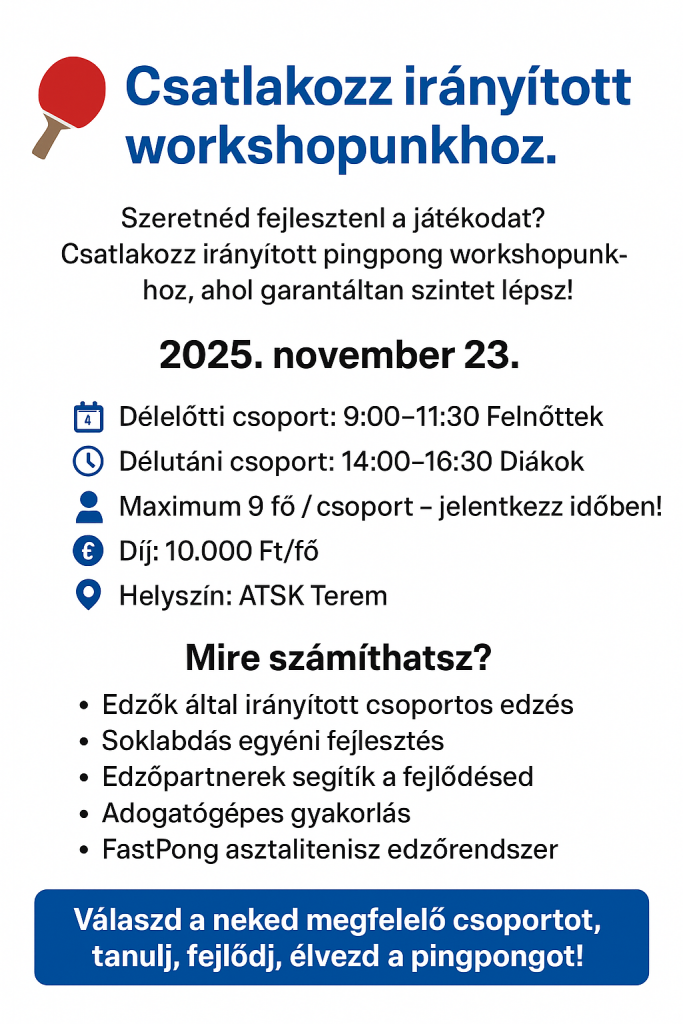 Hétvégi pingpong programot szerevünk az ATSK-ban november 23-án, felnőtt amatőr játékosoknak, illetve diákoknak!